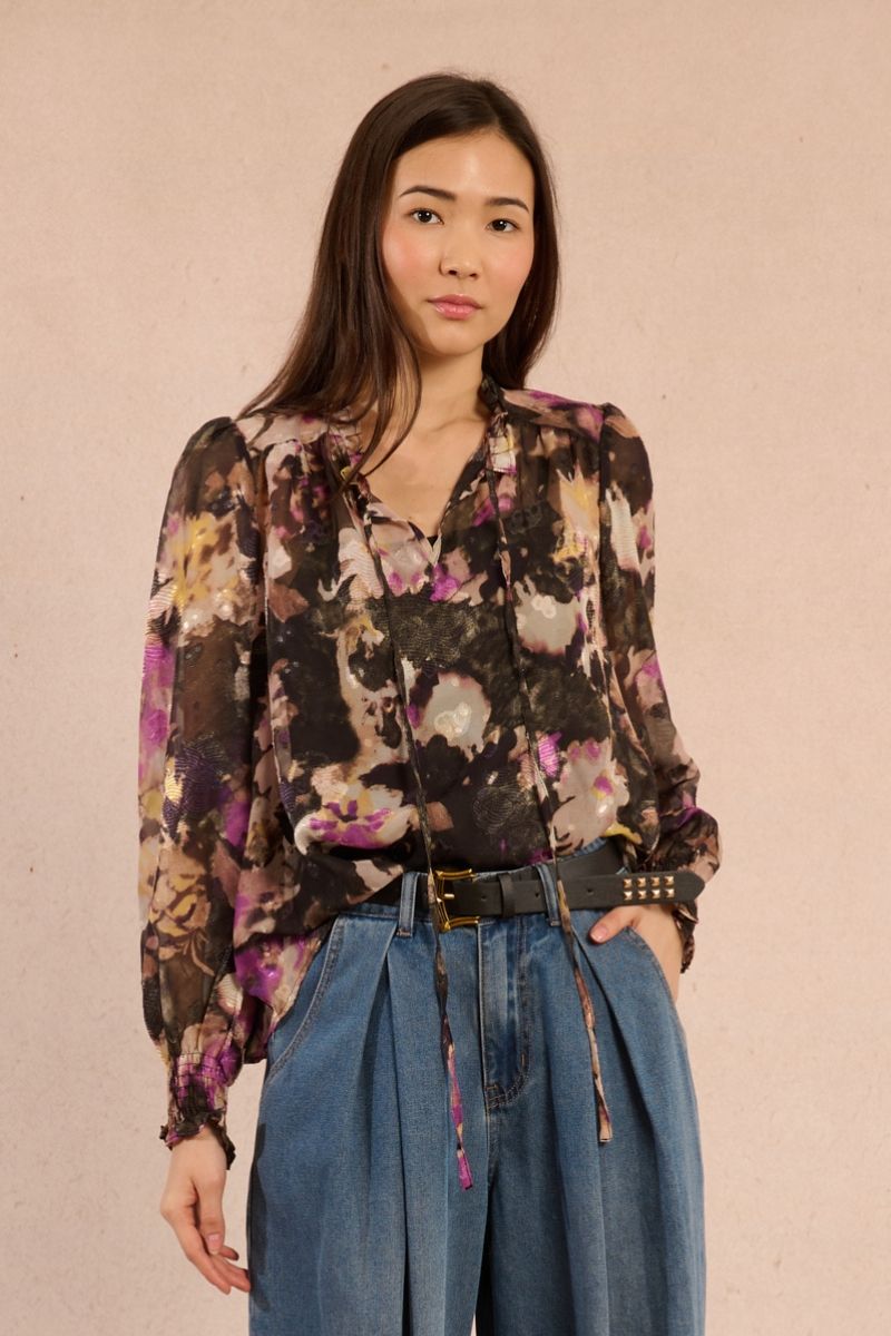 "-Fluid blouse in printed voile, semi-transparent -Long sleeves, wide smocked cuffs -Gathered officer collar highlighted by a V-neckline, held in place by a tie tie -Straight fit -Lined with a removable camisole -Length from the shoulder 60cm for a size S"