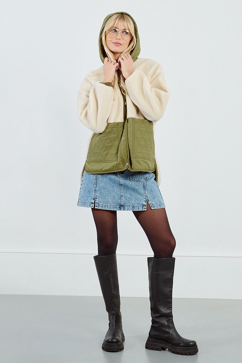 "-Long bi-material parka -Long sleeves -Round neckline, wide adjustable hood -Large patch pockets on the front sides -Snap button closure on the middle front -Fully lined -Length from the shoulder 69cm for a size S"