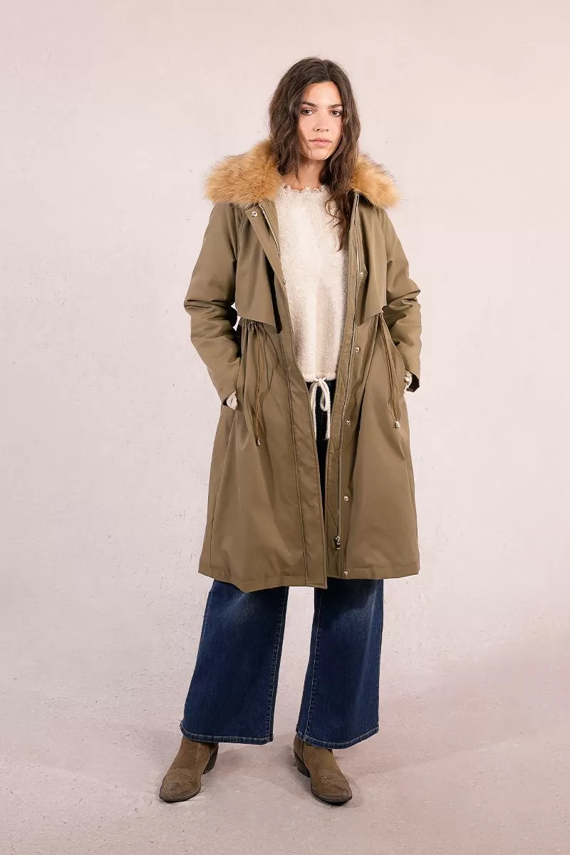 "-Long Parka -Wide detachable imitation fur collar -Side pockets on the sides -Lined interior -Adjustable waist by sliding link -Concealed front closure -Raincoat -Length from the shoulder 103 cm (for a size S)"