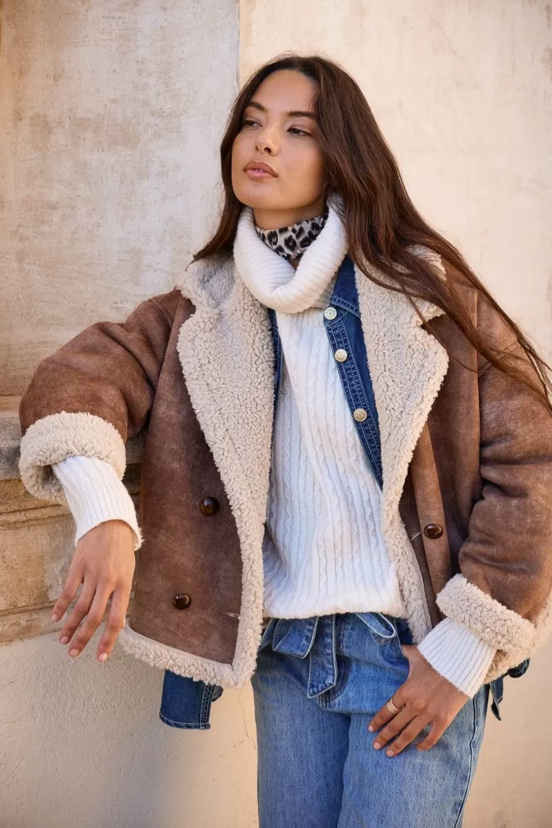"-Aviator style coat, imitation sheepskin -Bi-material -Long sleeves, textured cuffs -Wide tailored collar -Double-breasted criss-cross closure on the center front -Straight and short cut -Length from the shoulder 62cm for a size S"