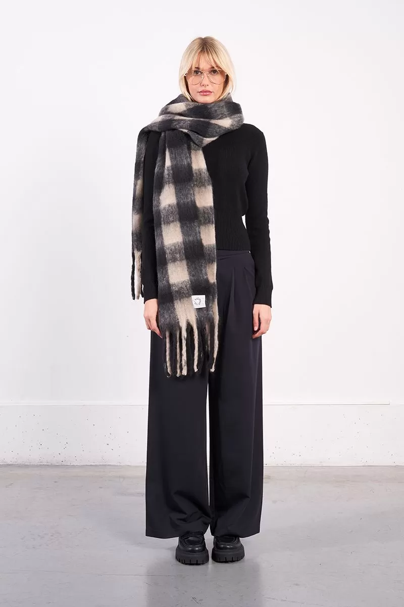 -Long woollen scarf-Two-tone check pattern-Reversible-Fringed finishes-Total length 97cm for one size fits all