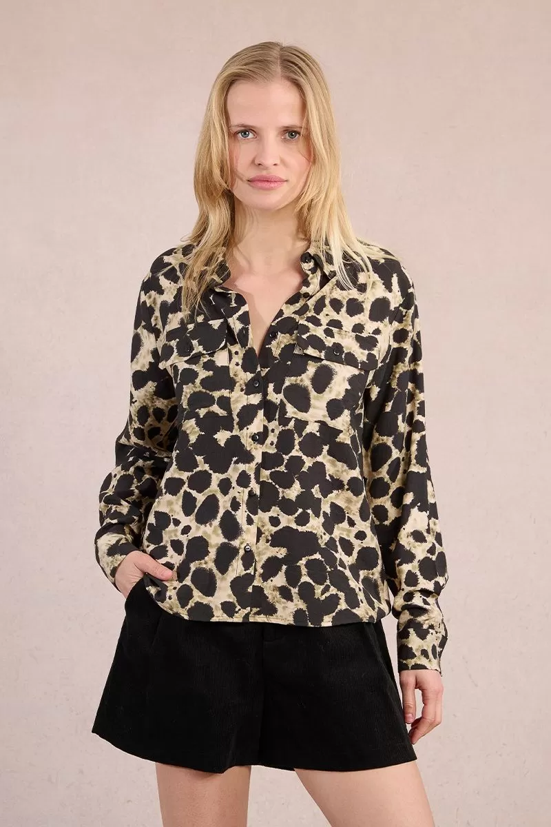 "-Flowing shirt -Animal print -Shirt collar -Long sleeves, buttoned cuffs -Patch pockets with flap on the chest -Button closure on the middle front -Length from the shoulder 63cm for a size S"