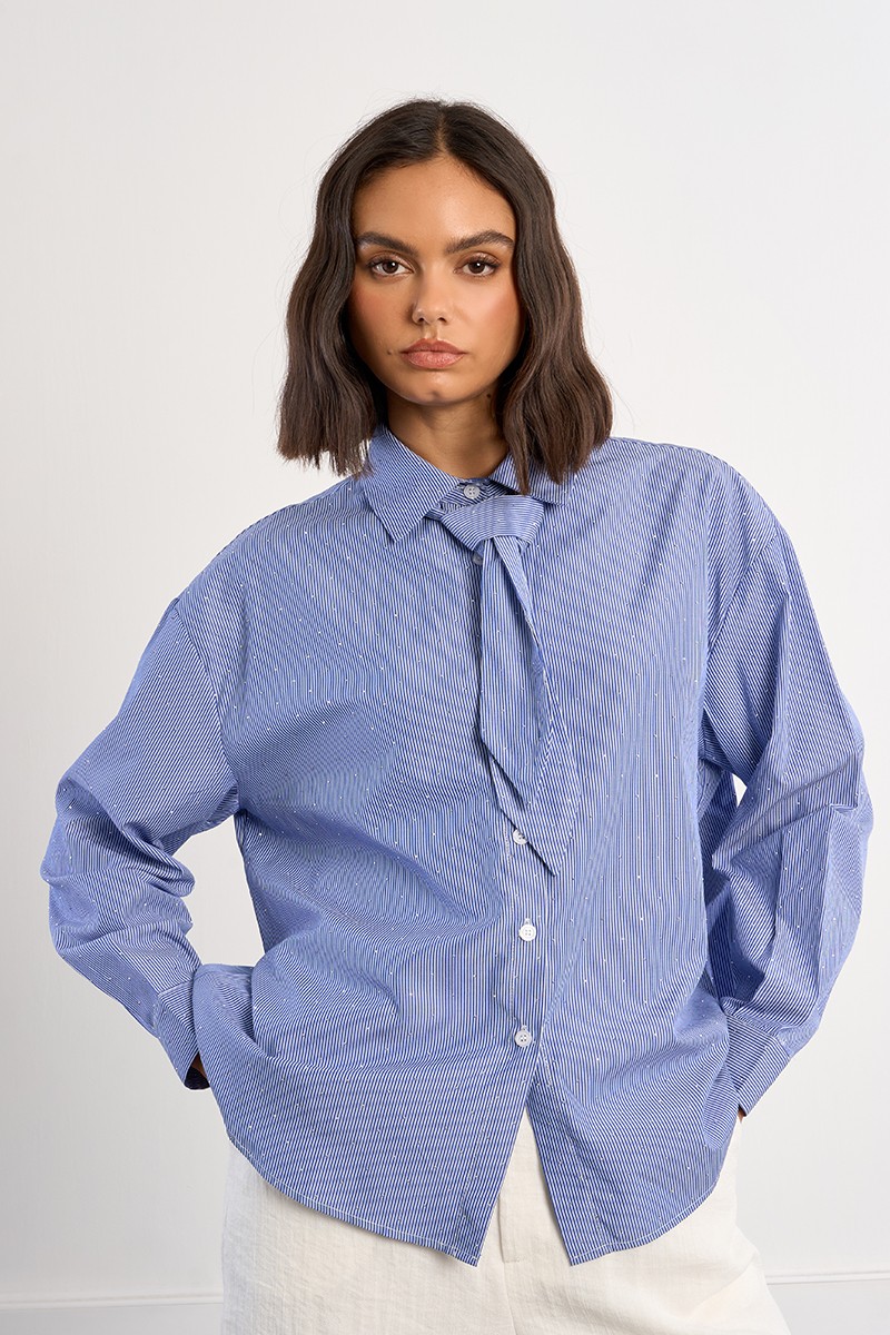 "-Oversized striped and rhinestone shirt, with tie -Long sleeves -Shirt collar -Full-length front button closure -Length from the shoulder 68cm for a size S"