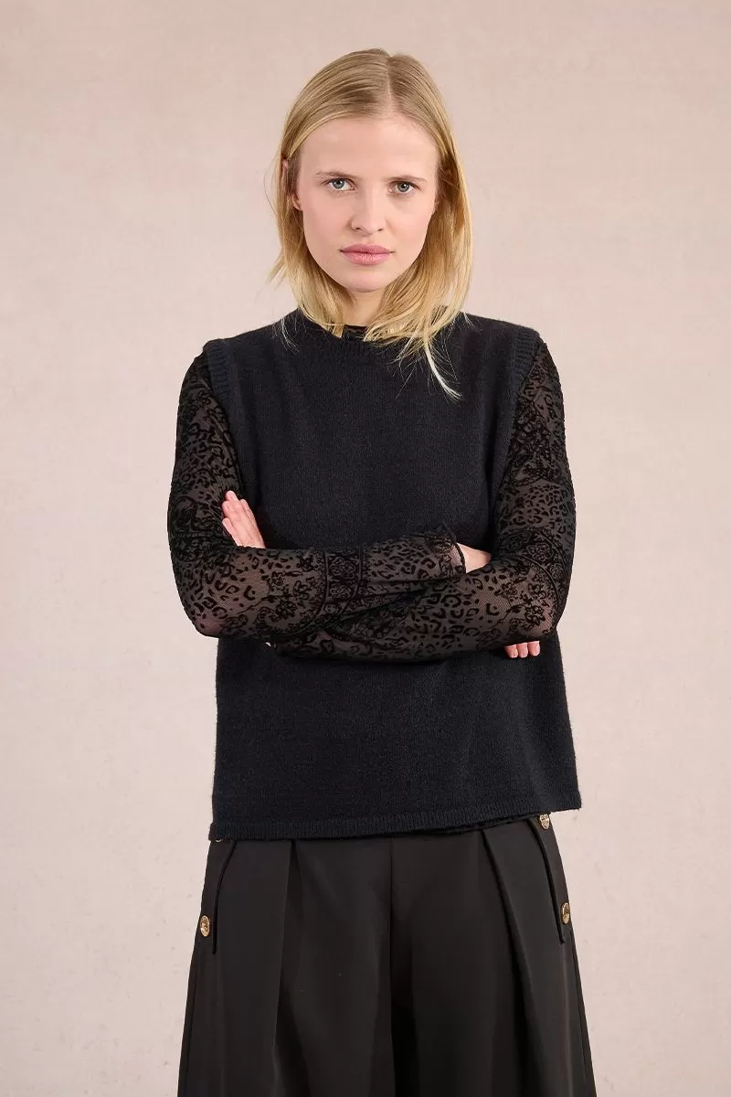 "-Sleeveless sweater -Straight fit -Neckline close to the neck -Buttoned at the upper back -Slit at the back, with a tie tie -Length from the shoulder 59cm for a size S"