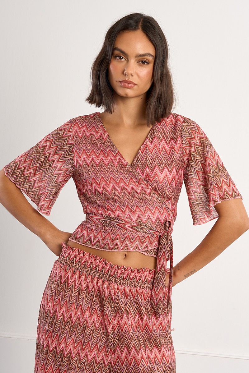 "-Printed wrap top -Short sleeves -V-neckline, crossed -Belt to tie at the waist -Short, slim fit -Length from the shoulder 46cm for a size S"