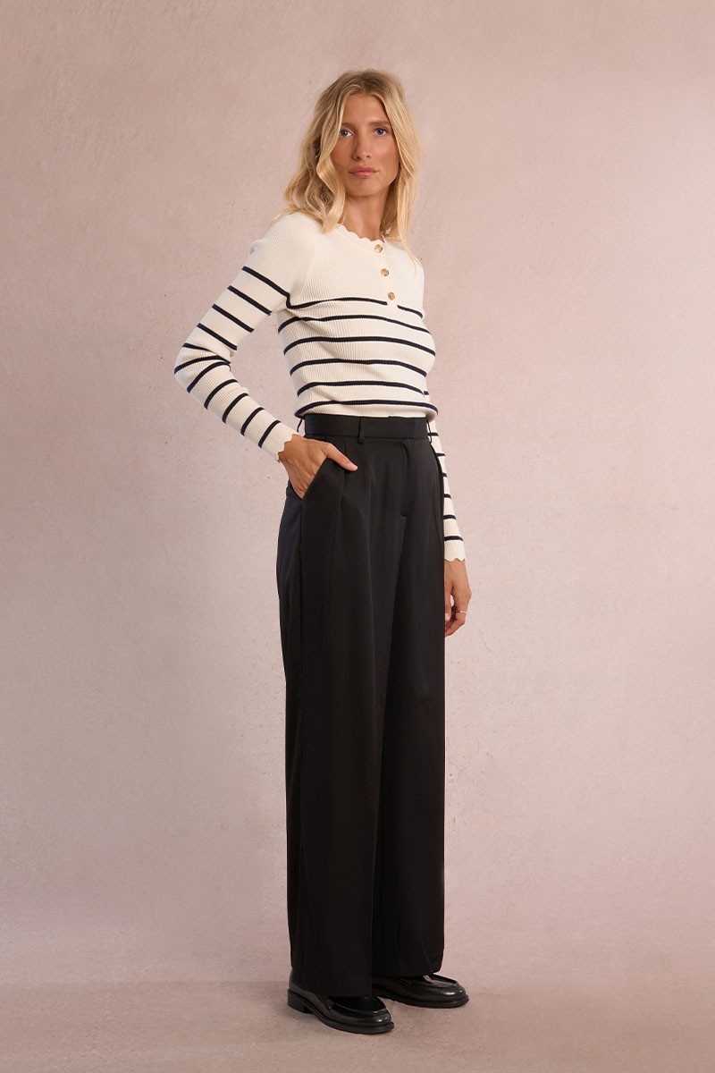 "-Wide pleated pants -High-waisted, belted with loops -Wide darts on the center front -Zip fly and hook closure -Side pockets -Straight fit -Side length 105cm for a size S"