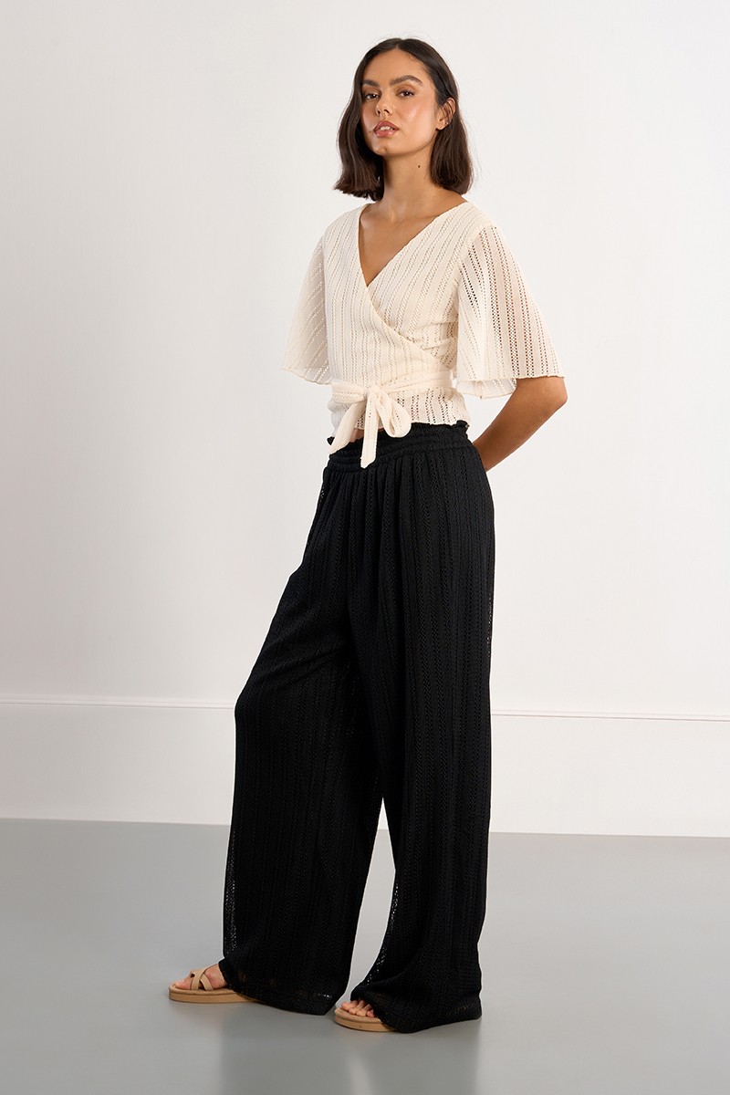 "-Wide pants with perforation -High-waisted, elasticated -Lined -Side length 105cm for a size S"