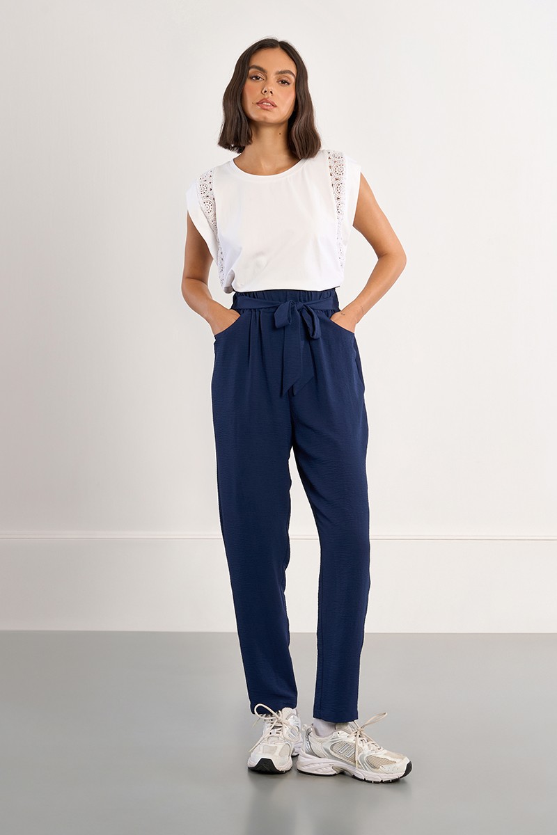 "-Carrot cut pants -High waist paperbag, enhanced by a tie belt -Side pockets -Large patch pockets on the back of the pants - Side length 102cm for a size S"