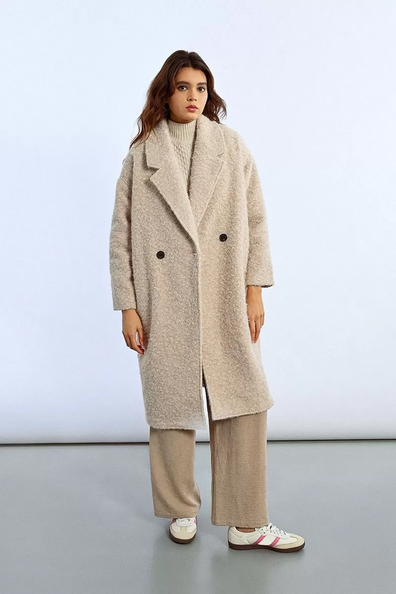 Abrigo largo, con cuello y solapa. Modelo en tejido de borrego, con bolsillos al bies y cierre frontal de doble botonadura.