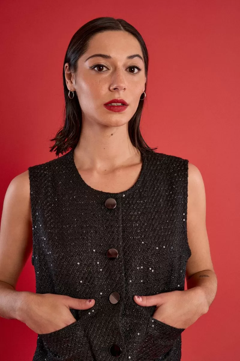 Chaleco corto, con cuello redondo y corte recto. Modelo en hilo mezclado, con cierre de botones frontal.