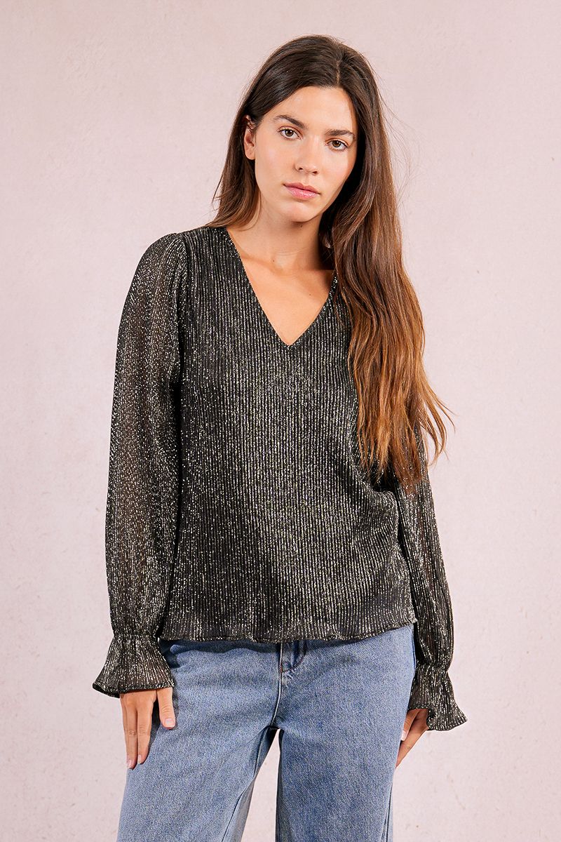 Top plisado, de manga larga poeta, con cuello de pico. Modelo en tejido brillante, semitransparente.