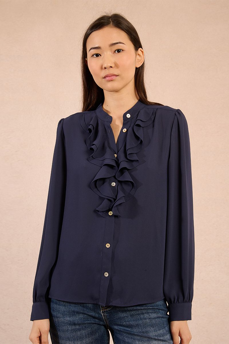 Camisa de manga larga, con cuello mao y corte recto. Modelo con detalle de volantes en la parte frontal.