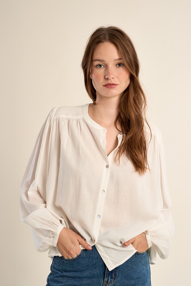 Camisa de manga larga, cuello redondo y corte recto. Modelo con detalle de pliegues y cierre de botones frontal.