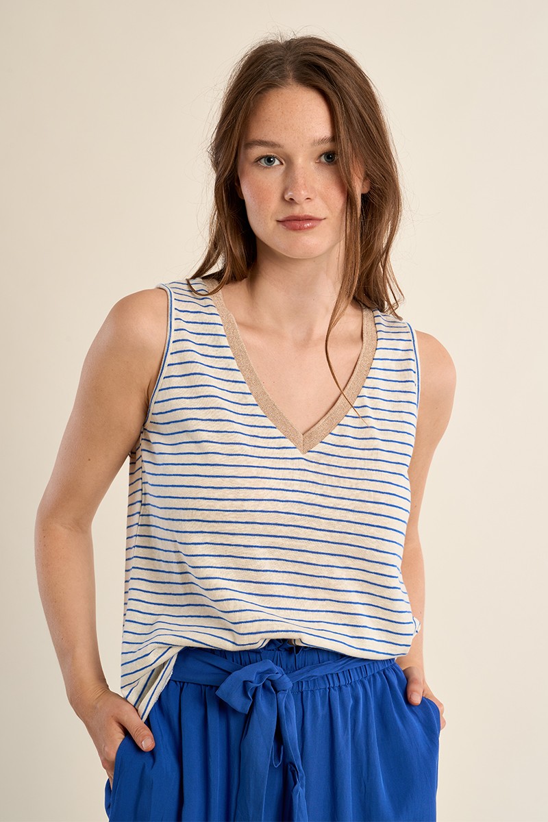 Top de manga sisa, cuello de pico y corte recto. Modelo con estampado de rayas.