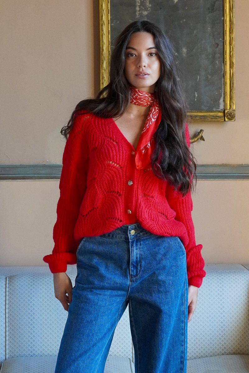 Cárdigan de manga larga, cuello de pico y corte recto. Modelo en punto mezclado, con cierre de botones frontal.