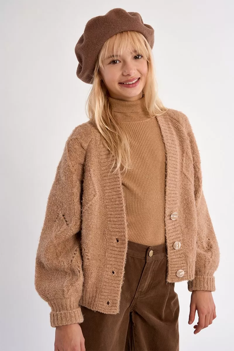 Cárdigan de manga larga abullonada, escote de pico y corte recto. Modelo en punto mezclado y cierre de botones frontal.