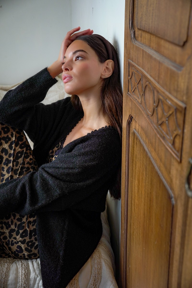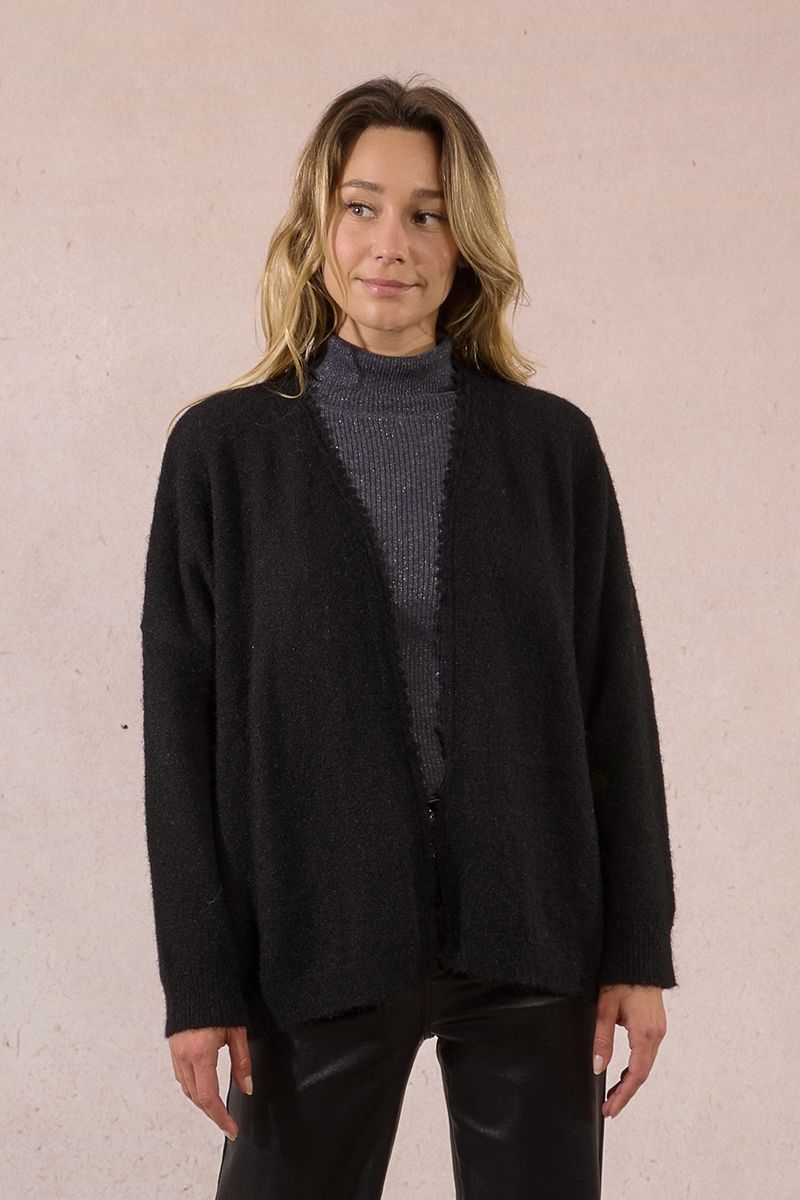 Cárdigan de manga larga, corte amplio, con detalles bordados en los extremos. Modelo sin cierre frontal.