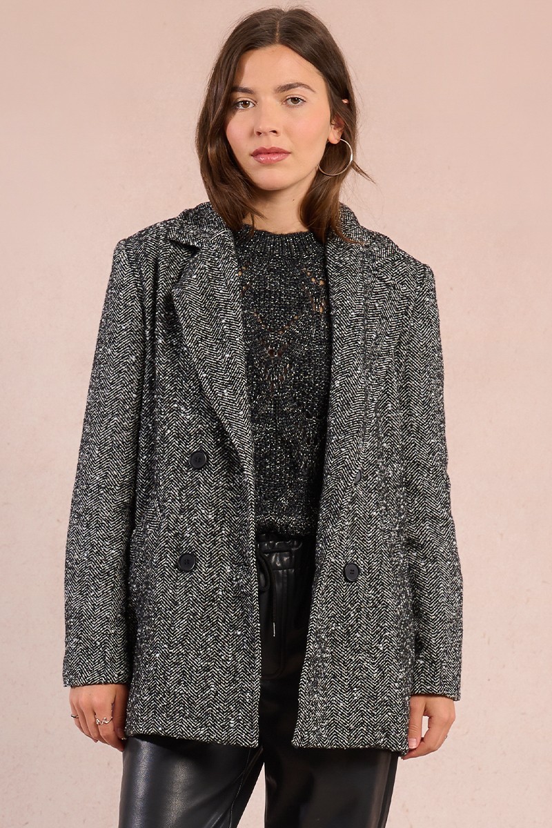 -Chaqueta estilo blazer con diseño en espiga y pedrería. -Mangas largas. -Cuello sastre. -Corte recto. -Cierre con doble botonadura cruzada en la parte delantera. -Bolsillos laterales. -Forrada. -Longitud desde el hombro: 75 cm para la talla S.