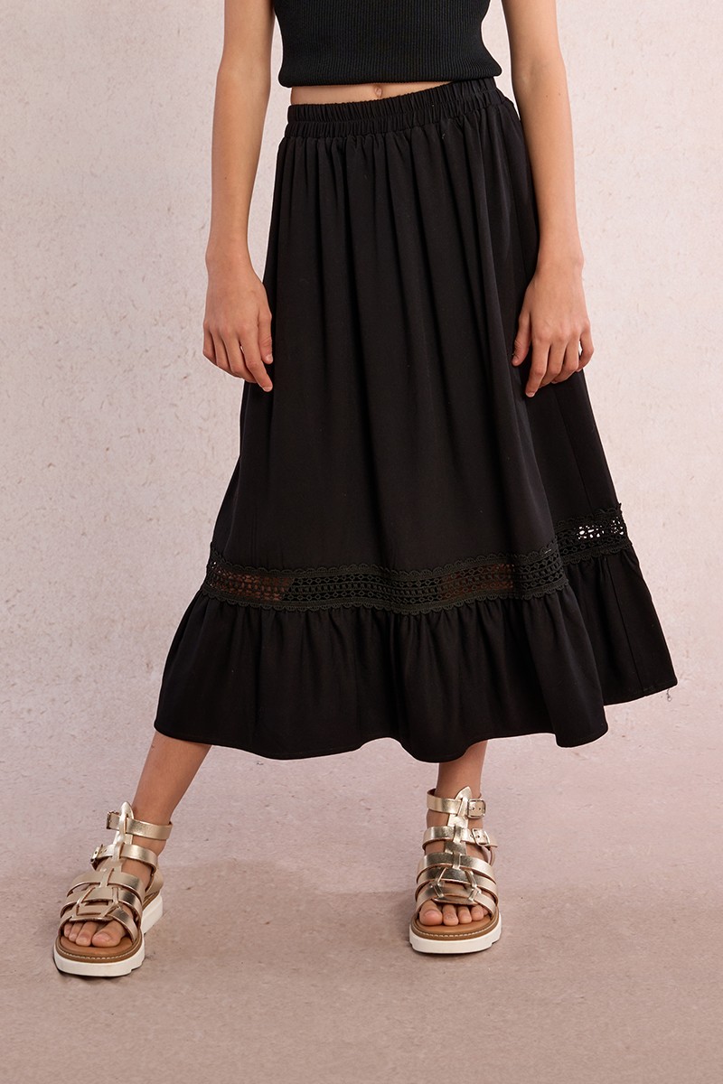 Falda larga, de tiro alto y cintura elástica. Modelo con detalles bordados y volante en el bajo.