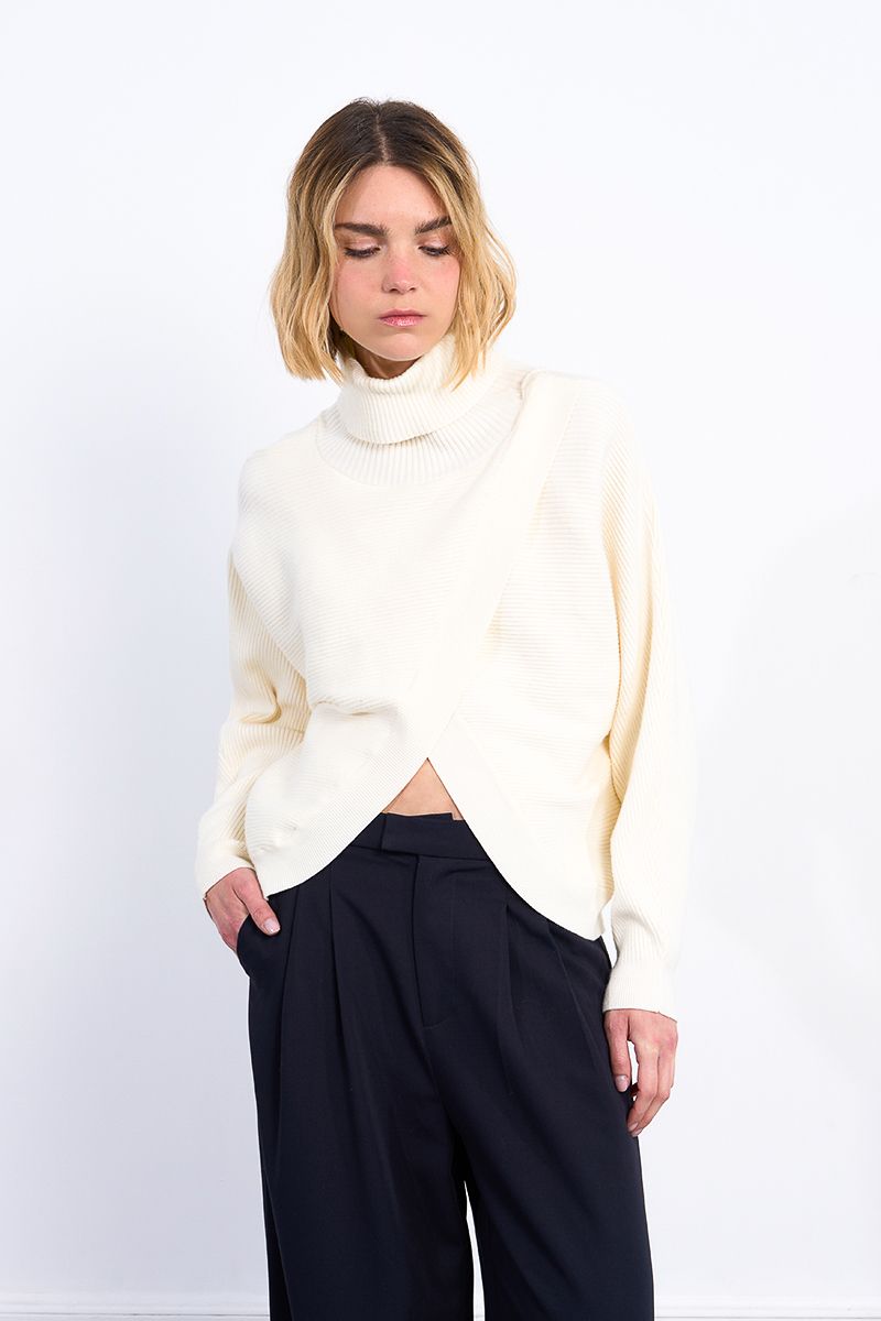 Jersey de manga larga, cuello alto y bajo asimétrico, cruzado. Modelo en punto de canalé.