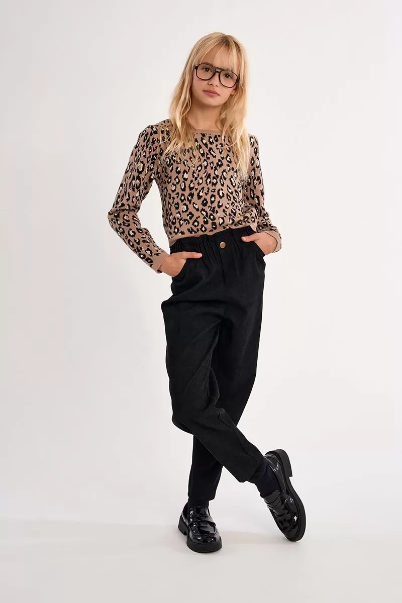 Pantalón largo, de tiro muy alto y cintura elástica con volantes. Modelo de cuatro bolsillos.