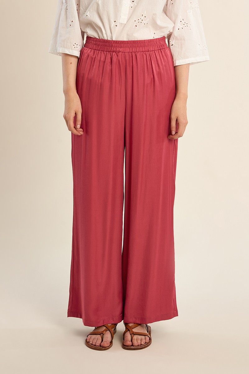Pantalón largo, de tiro alto y cintura elástica. Modelo de perneras anchas, con pliegues.