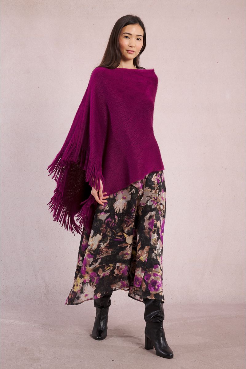 Poncho amplio, en tejido suave y cuello de pico. Modelo con flecos largos en los extremos.