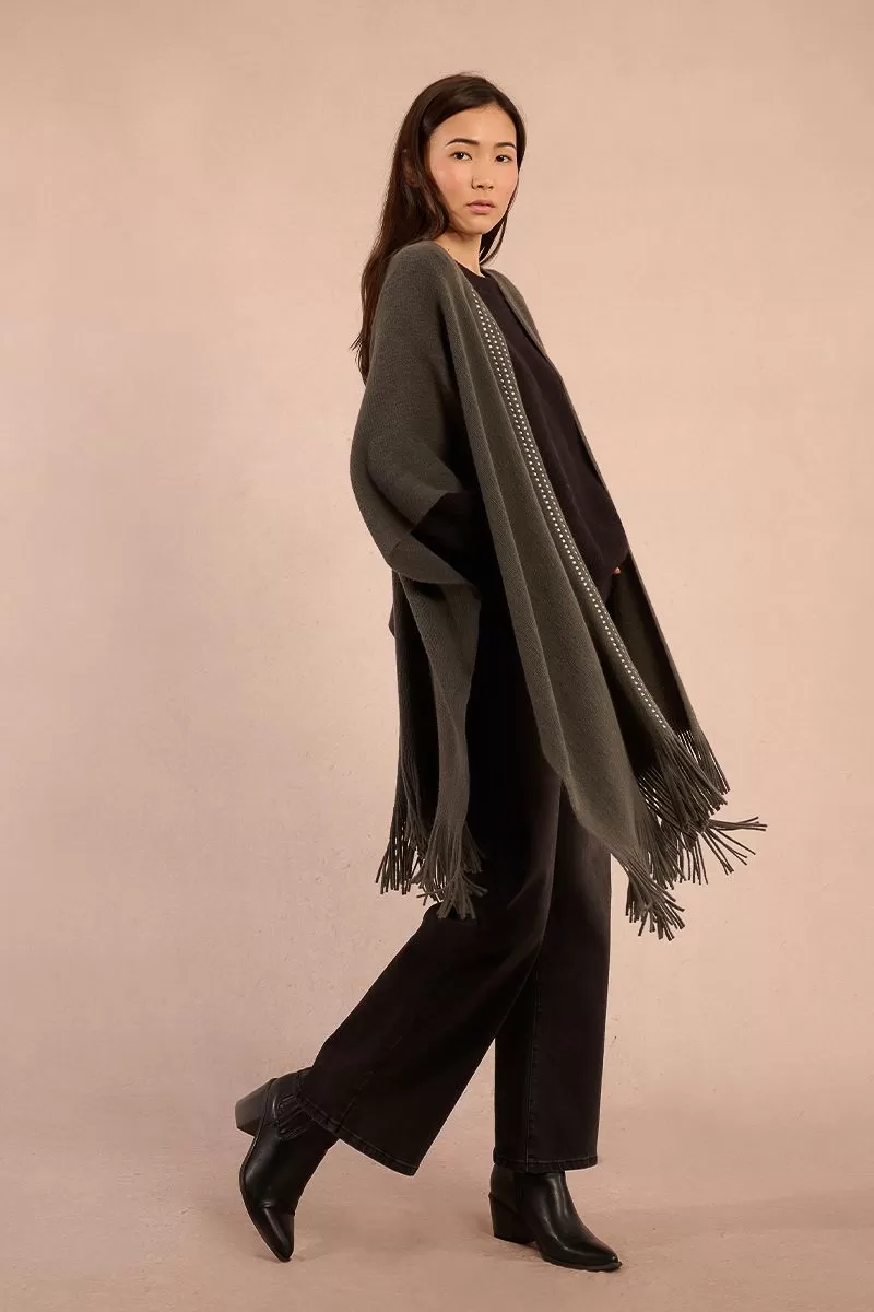 Poncho largo, asimétrico, sin cierre frontal. Modelo con flecos largos en el bajo.