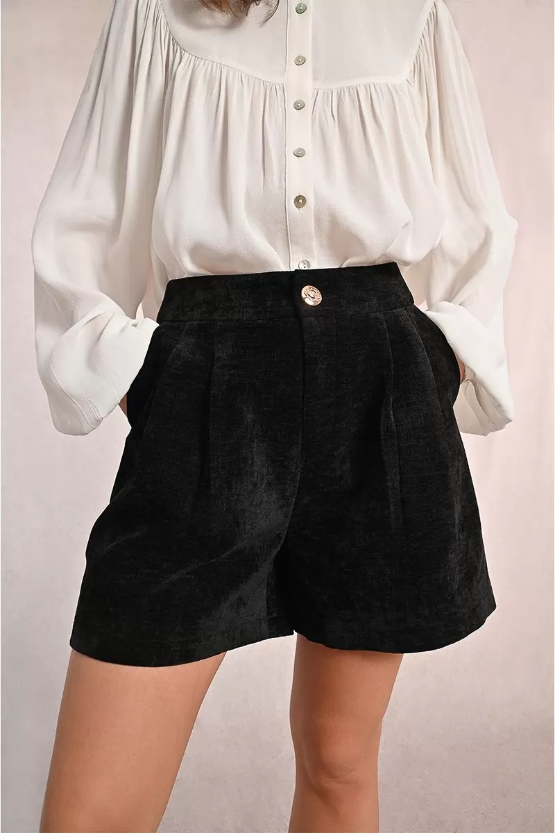 Short corto, de tiro alto y perneras rectas. Modelo en tejido aterciopelado de pana, con detalle de pliegues.