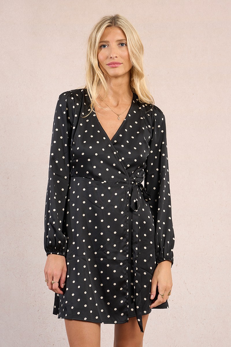 Vestido corto, de manga larga, escote de pico y cierre cruzado con lazada. Modelo con estampado de lunares.