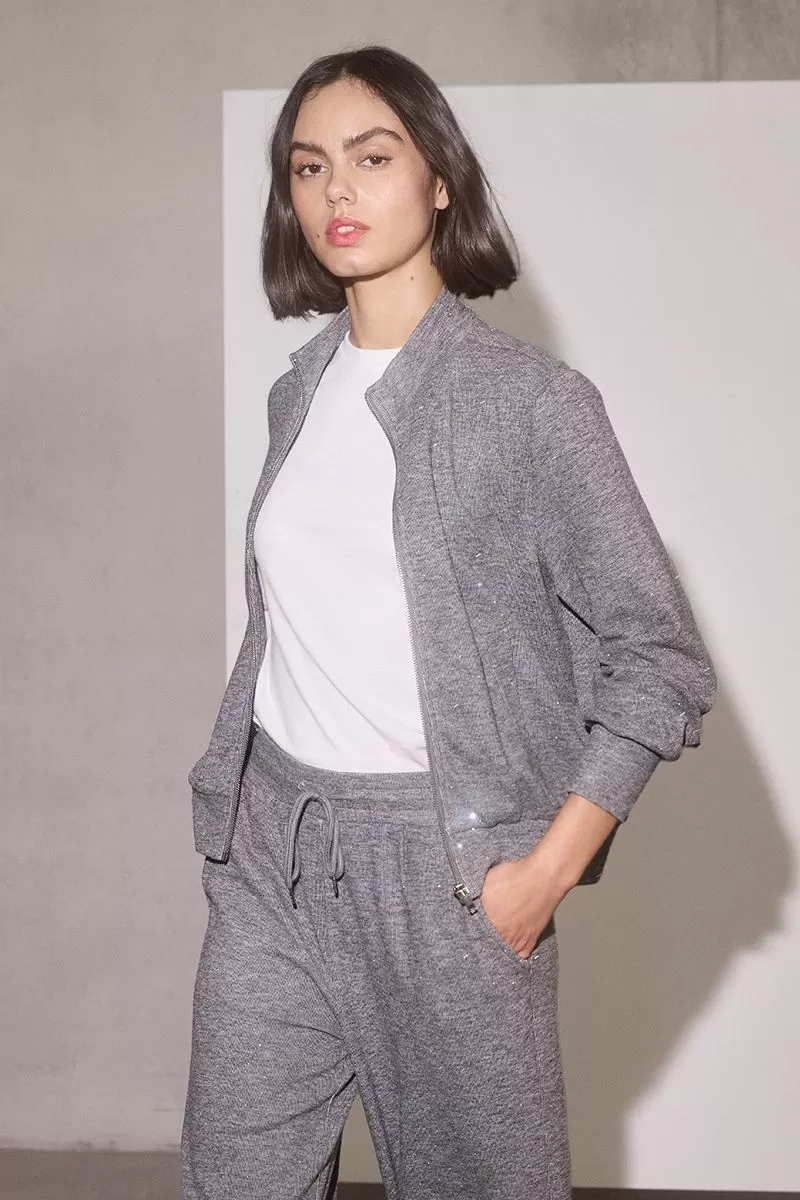 "-Veste bomber parsemé de strass -Manches longues, poignets resserrés -Col semi-montant -Poche raglan sur chaque côté -Fermeture par zip sur toute la longueur devant -Longueur depuis l'épaule 58cm pour une taille S"