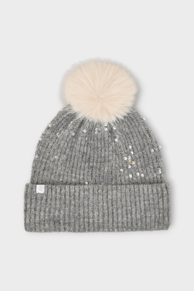 -Bonnet en maille côtelée-Gros pompon sur l'extrémité-Maille parsemée de strass-Large revers-Logo trèfle cousu sur le côté