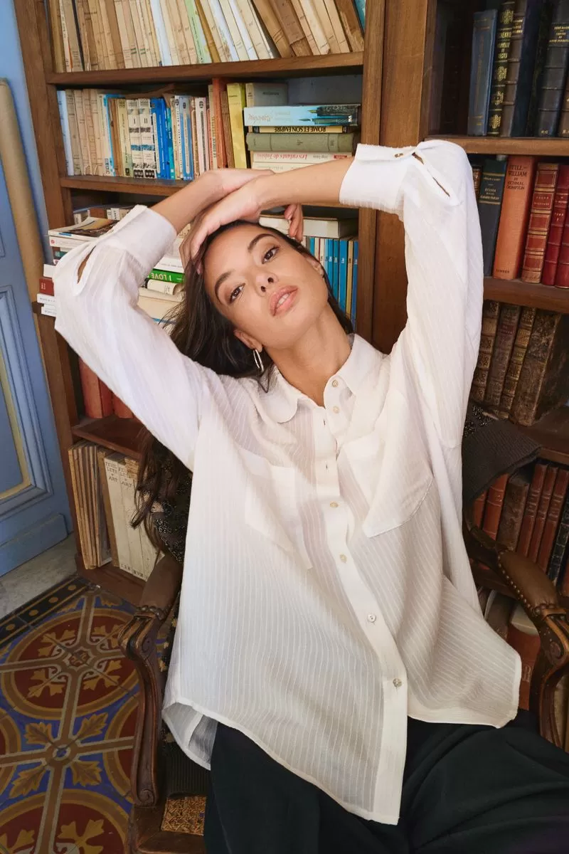 "-Chemise rayée en semi-transparence -Manches longues -Poignets resserrés et boutonnés -Col chemisier -Poches plaquées sur la poitrine -Fermeture par boutons nacrés sur le milieu devant -Coupe droite -Longueur depuis le côté 69cm pour une taille S"