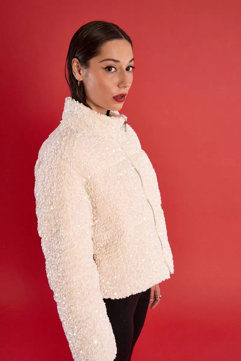"-Doudoune matelassée recouverte de sequins -Manches longues -Col montant -Poches latérales -Fermeture par zip sur toute la longueur devant -Longueur depuis l'épaule 56cm pour une taille S"