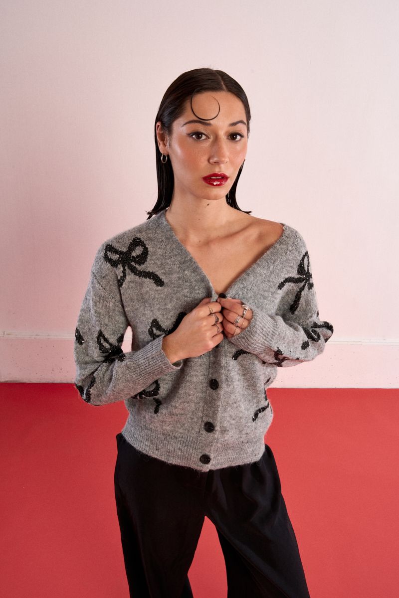 "-Cardigan long et droit en maille -Manches longues -Encolure V -Motif noeuds à sequin -Fermeture par boutons contrastés sur le milieu devant -Finition poignets et bas vêtements côtelée -Longueur depuis l'épaule 57cm pour une taille S"