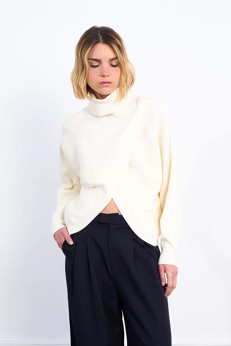 "-Pull en maille -Manches longues -Large col roulé -Pan croisé sur le devant -Coupe courte sur le milieu devant et plus longue sur les côtés -Finition col, poignets, et bordure de pan côtelée -Longueur depuis l'épaule 55 cm pour une taille S"