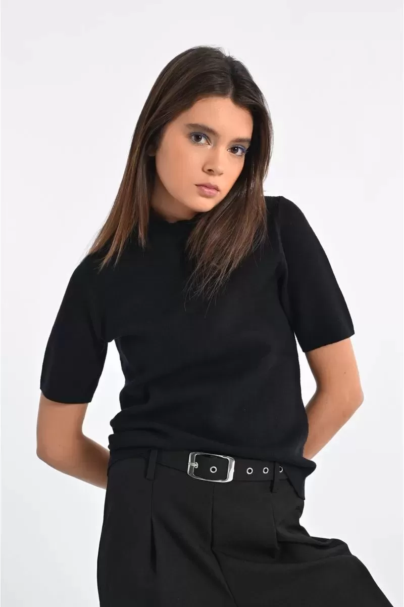 "-Pul fin en maille côtelée -Manches courtes -Col roulé -Coupe ajustée -Longueur depuis l'épaule 59cm pour une taille S"