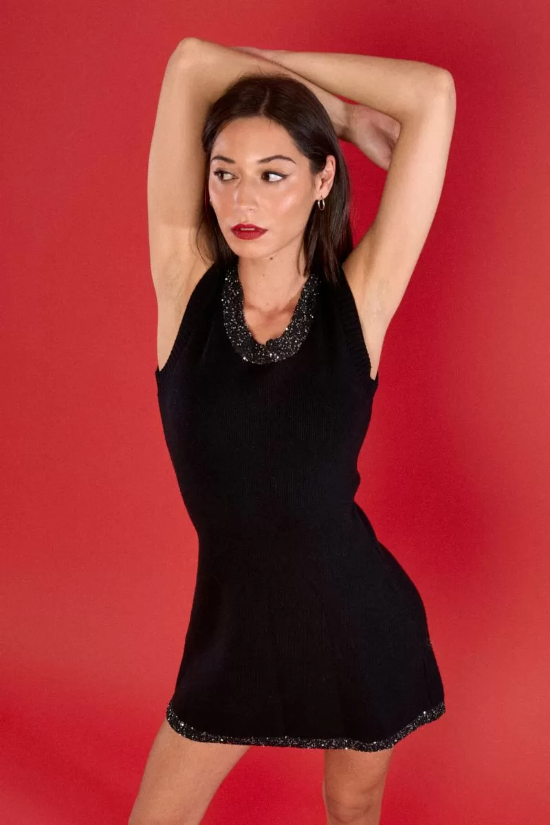 "-Robe patineuse en maille -Sans manches -Encolure et bas vêtement réhaussés de sequins -Taille marquée -Longueur depuis l'épaule 85cm pour une taille S"